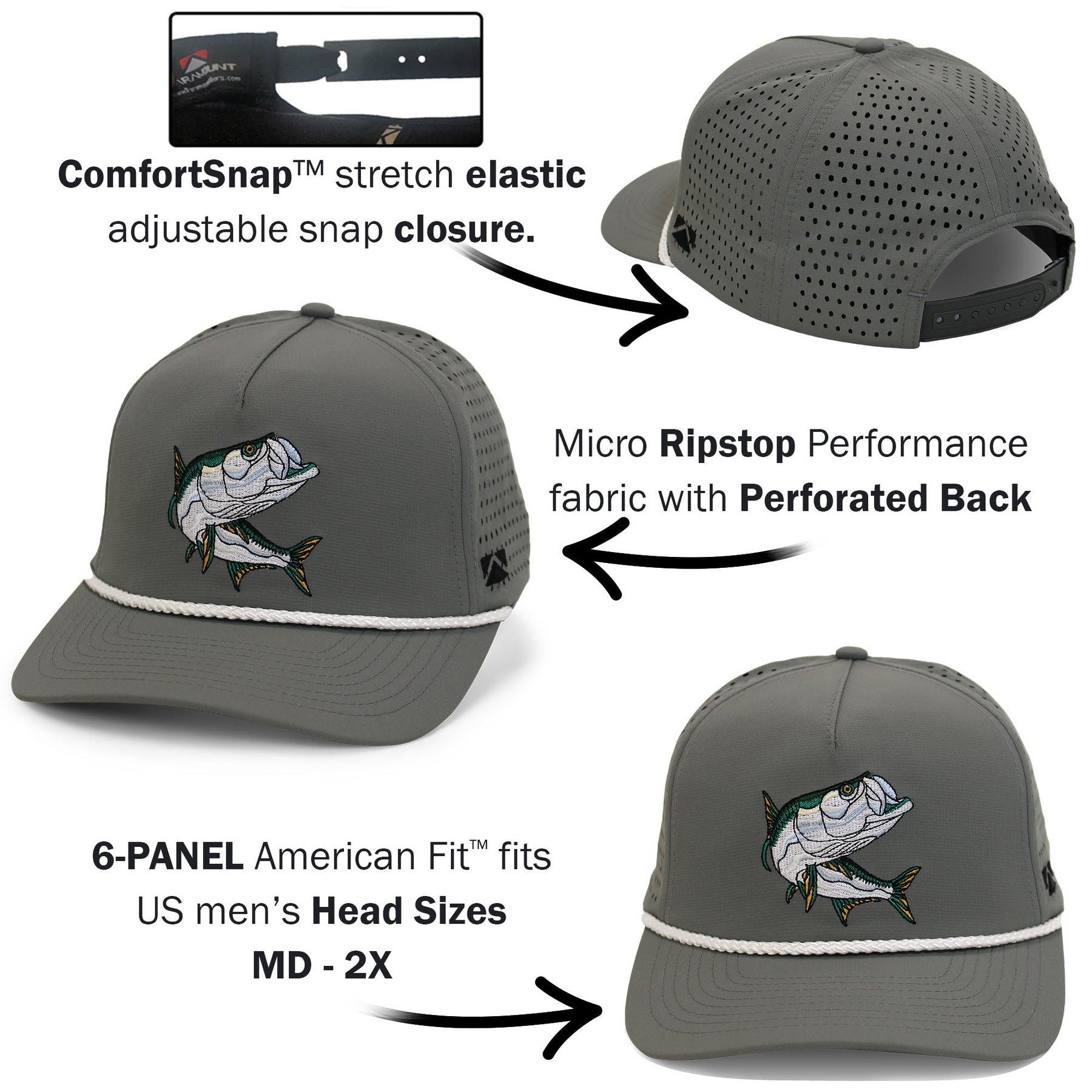 The Tarpon performance sport fishing hat is built on our Base Camp 5-Panel rope cap style. This saltwater fishing cap features laser perforated back panels with a structured front and a slightly curved visor. Constructed with lightweight micro ripstop quick dry performance fabric ideal for hot days on the casting deck. Our COMFORT SNAP™ snapback closure combines the stretch of elastic with the adjustability of a snapback, allowing for a custom stretch fit. Lastly, this tarpon hat features our American™ Fit sizing that fits men’s US head sizes MD – XX.