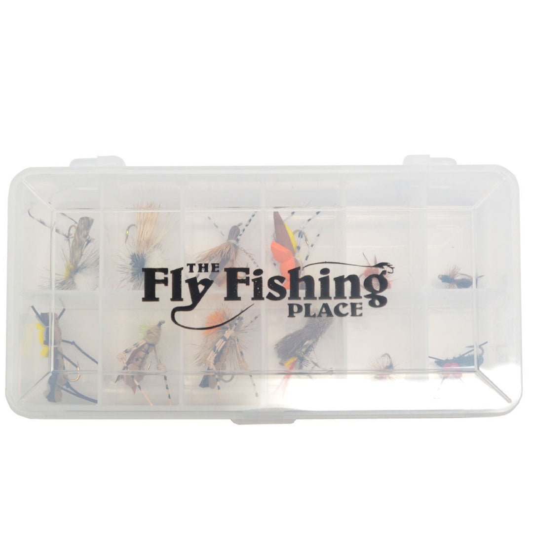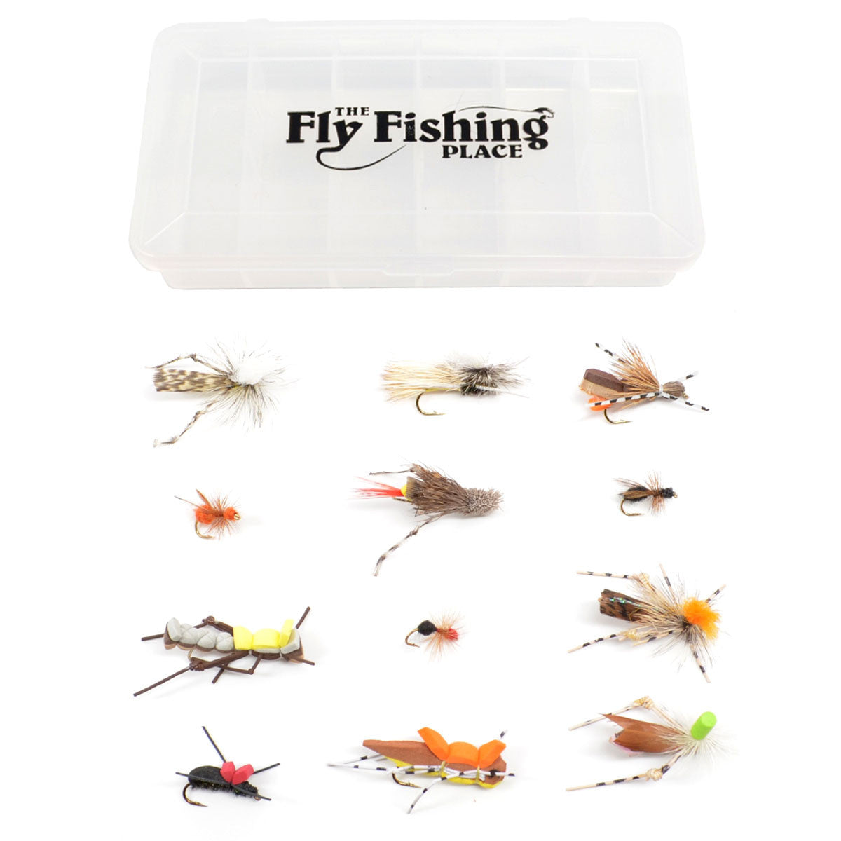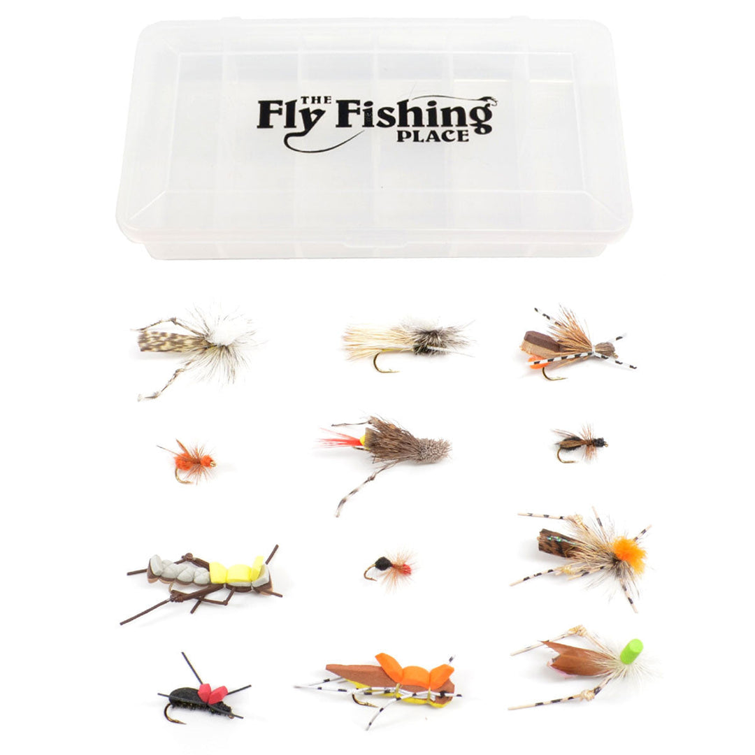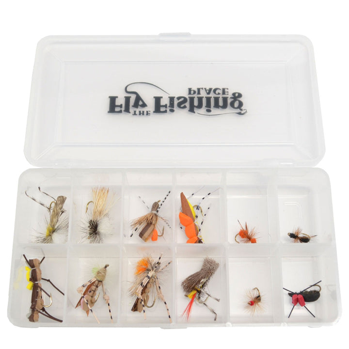 Trout Fly Assortment - Essential Terrestrials Fly Fishing Flies Collection - Includes Foam Hoppers, Ants, Beetles, and Cicadas - 1 Dozen Trout Flies with Fly Box